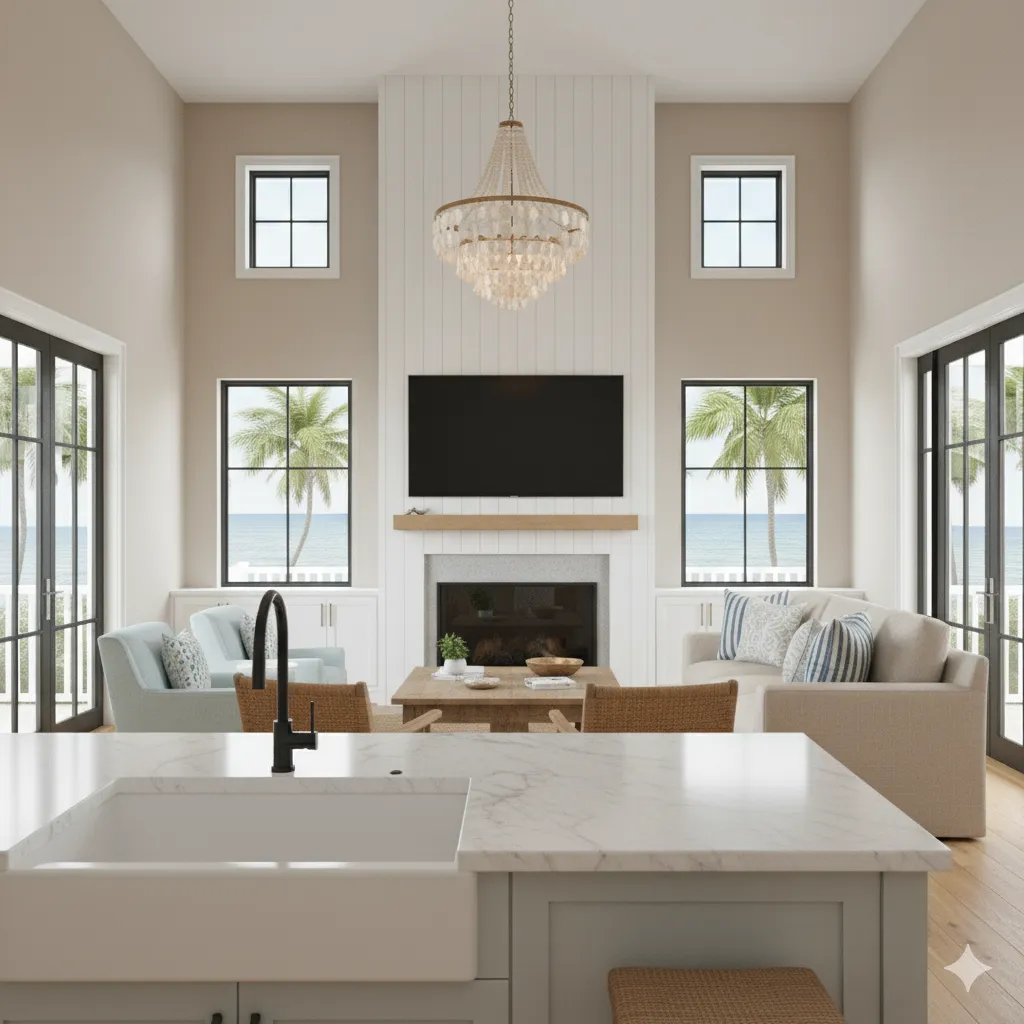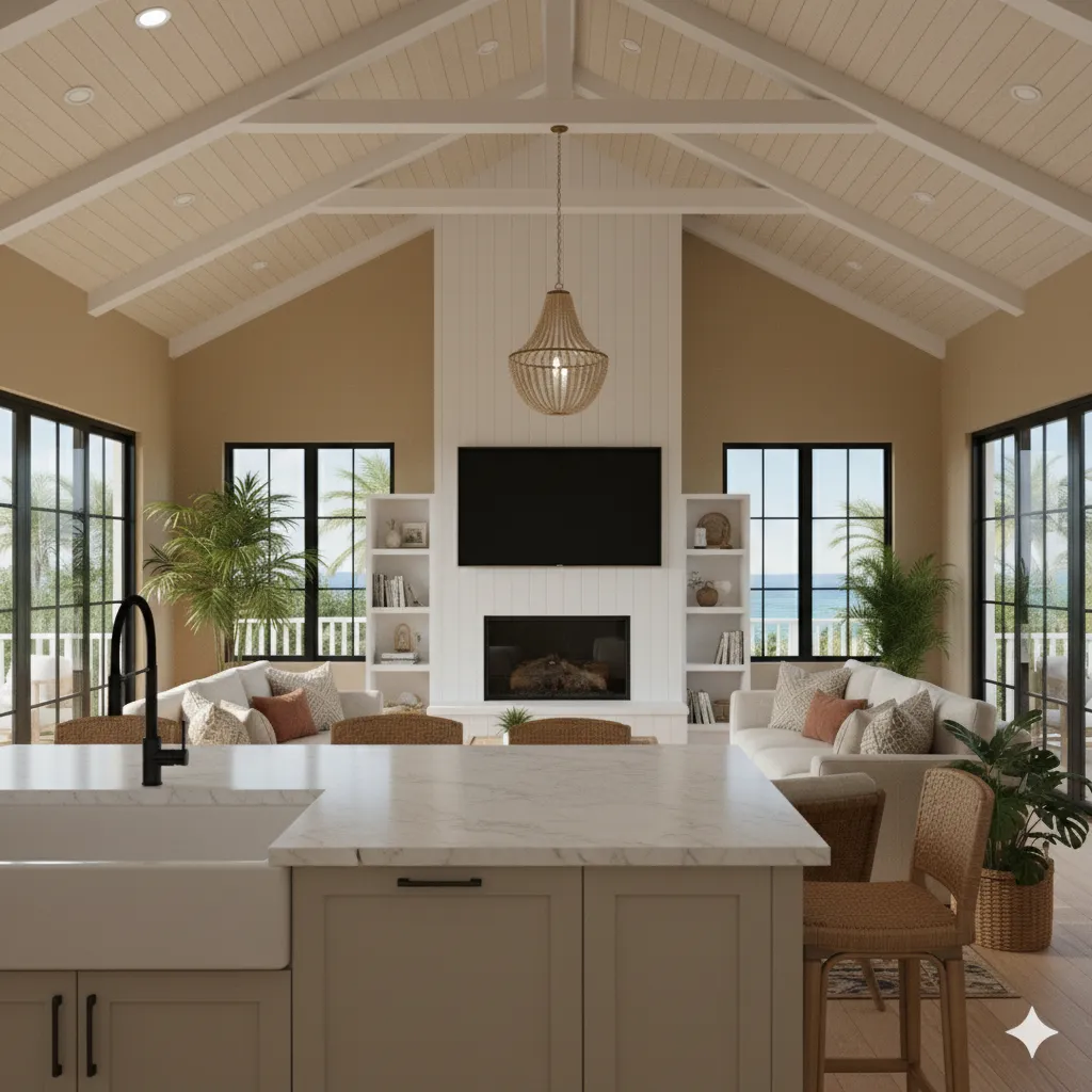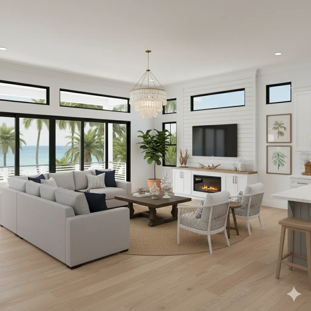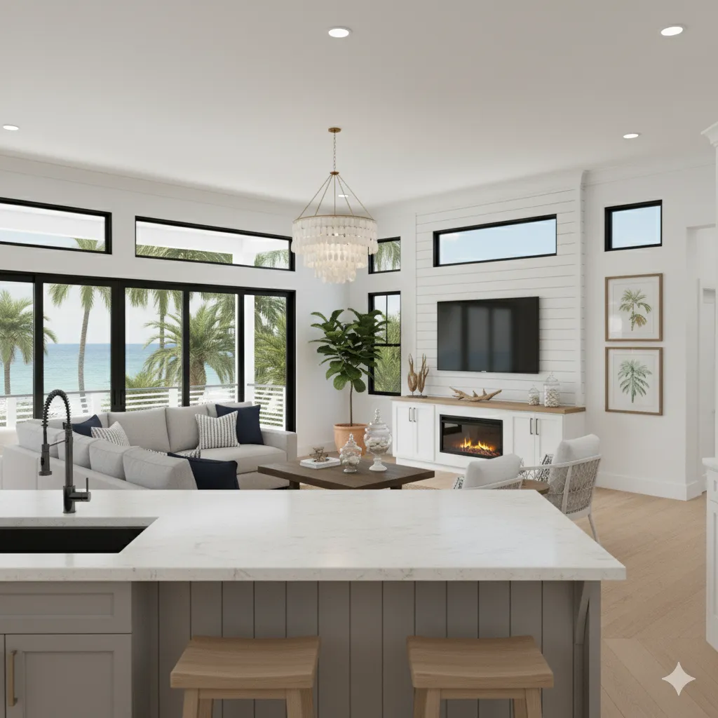 Designed for lots with tidal risk, Seabreeze places living spaces above engineered garage and storage to meet FEMA and local elevation requirements. Open-plan living, large screened porches, and hurricane-rated glazing make it a family-friendly coastal retreat.