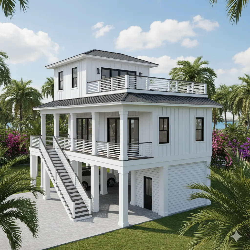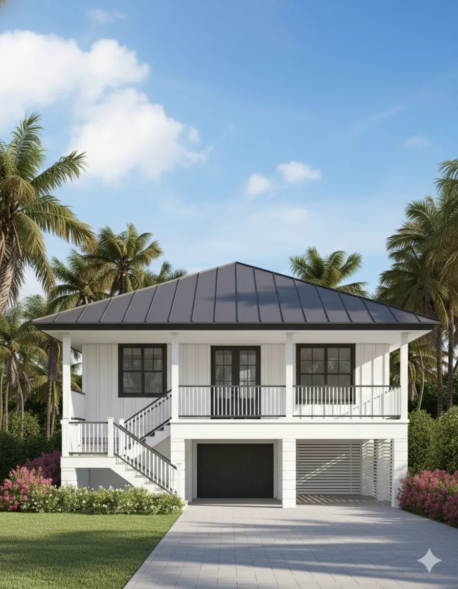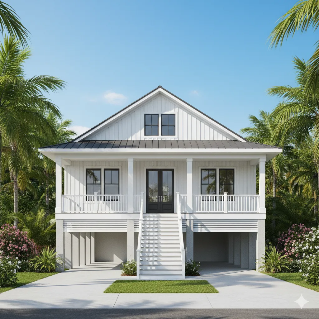 Elevated foundations (when required), reinforced connections, wind-rated fenestration, and salt-resistant cladding to reduce corrosion and maintenance over time. Meets local code and FEMA guidance where applicable.